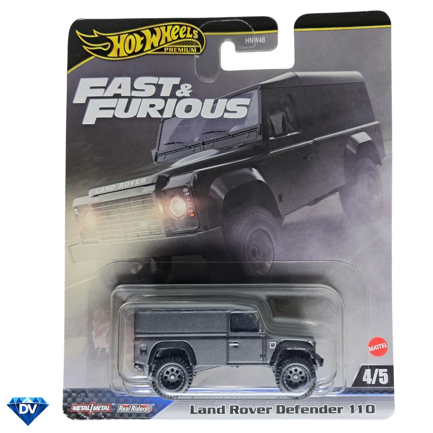 Land Rover Defender 110 Hard Top de la serie Fast & Furious: Furious Off-Road, modelo Hot Wheels Premium con cuerpo y base metálica, llantas Real Riders y pieza número 4 de 5 de la colección.